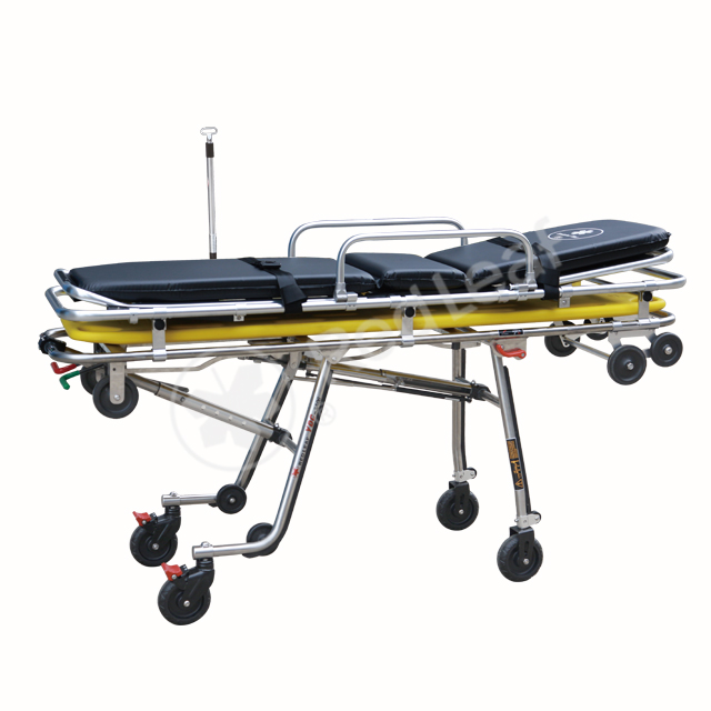 2. Con barandas de aleación de aleación de aluminio fácilmente para que el paciente se encienda o se apague de la camilla, con dos cinturones de seguridad garantiza la seguridad del paciente durante el transporte.